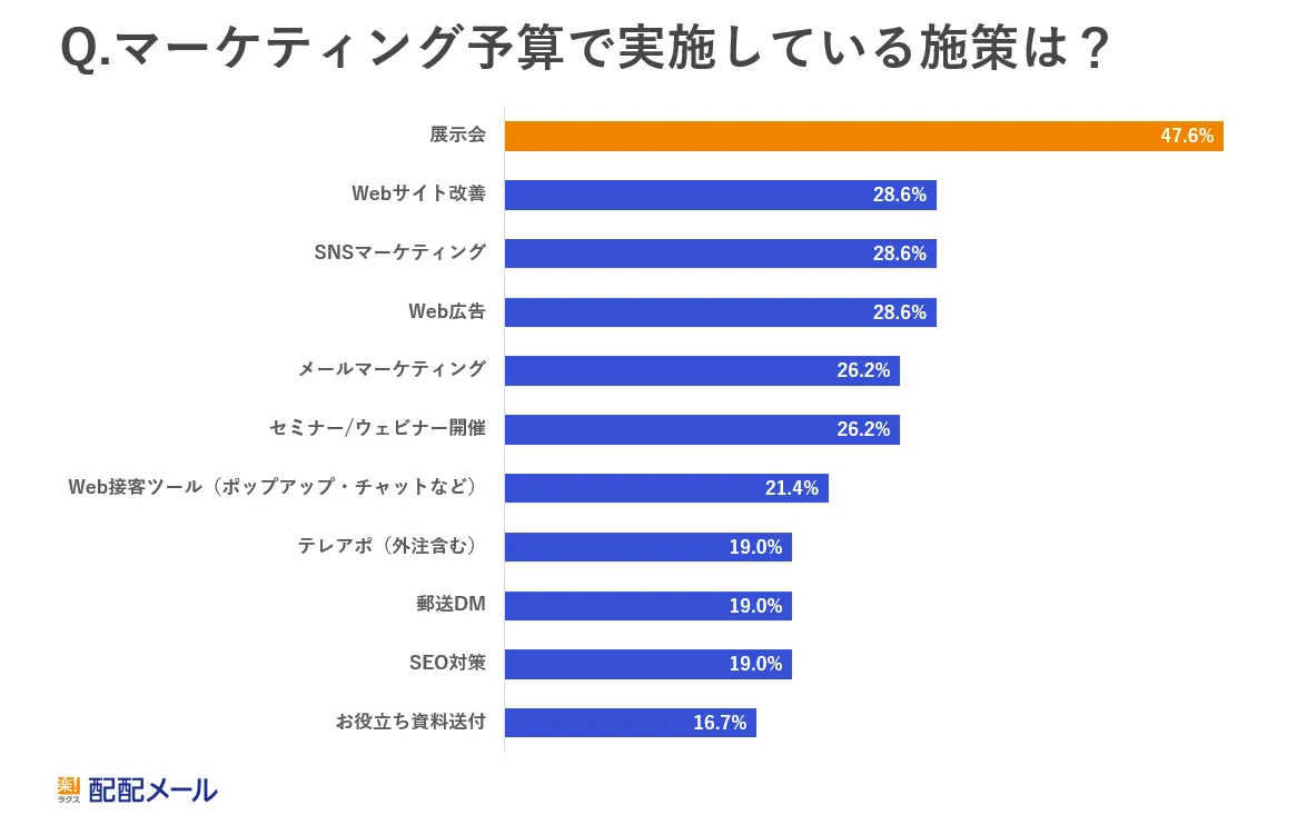 具体的には、「展示会(76.8%)」と「セミナー/ウェビナー(64.3%)」といったイベント施策が予算の主要な使い道となっていました。これらの施策が効果的だとされる理由として、展示会は認知向上に寄与し、セミナーやウェビナーは適切なターゲットへのアプローチができる点が挙げられています。