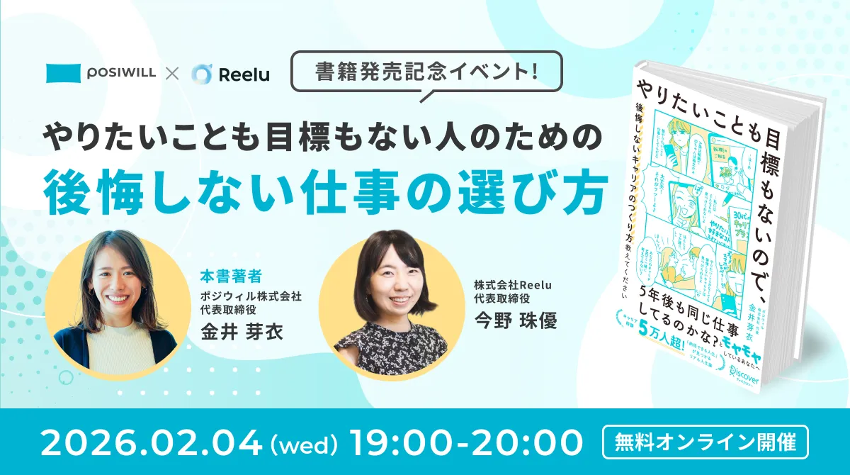 株式会社Reelu(東京都港区)が、ポジウィル株式会社(東京都千代田区)代表・金井芽衣氏の新刊『やりたいことも目標もないので、後悔しないキャリアのつくり方教えてください』の刊行を祝して、特別なオンライン対談イベントを企画しました。このイベントは、2026年2月4日(水)19:00よりZoomで行われ、参加者が自分自身のキャリアへの指針を持ち帰れるようにと設計されています。