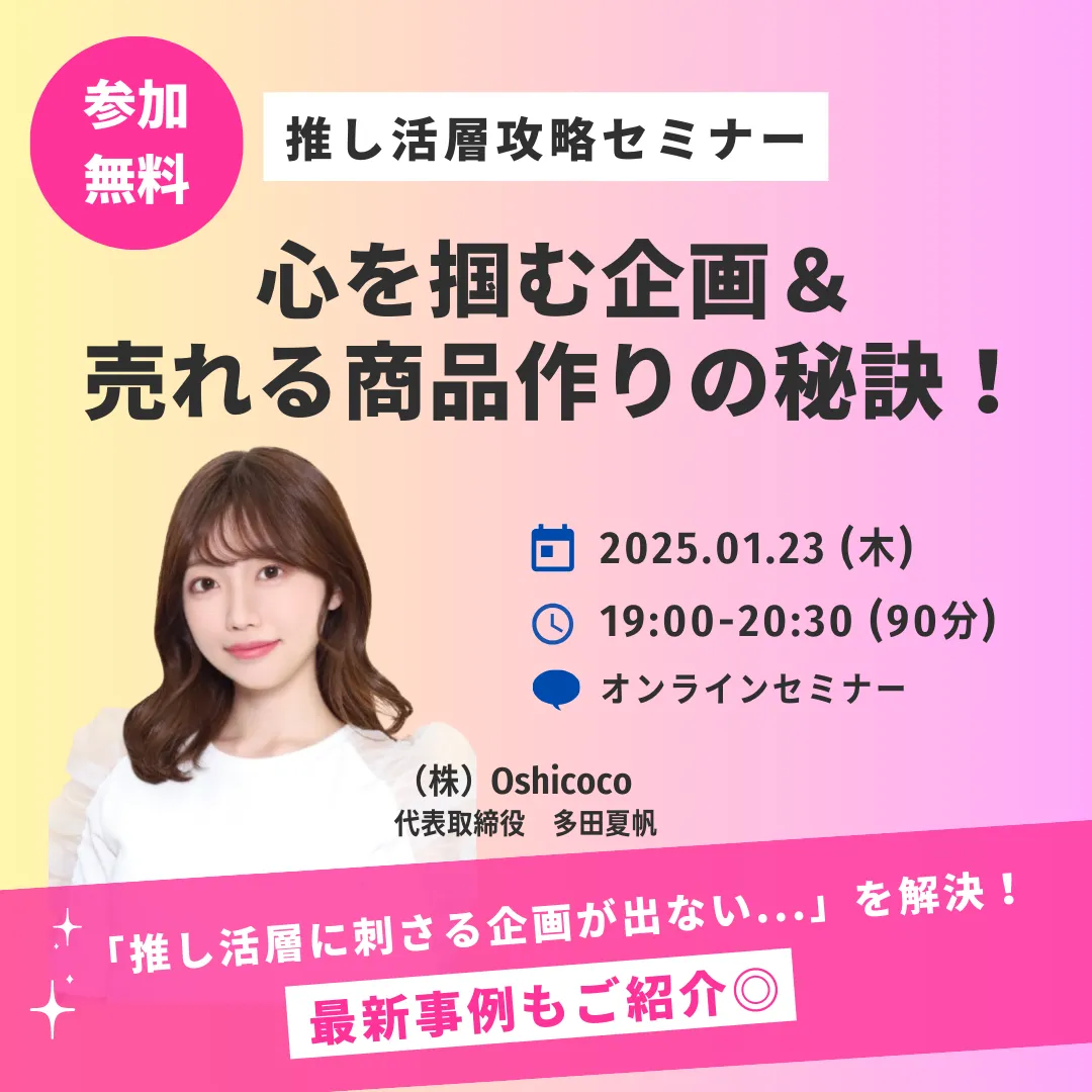 昨今、SNSを通じて「推し活」を行うユーザーが急増しており、それに伴いマーケティングの重要性もますます高まっています。この度、株式会社Oshicocoが主催するオンラインセミナー「心を握む企画&売れる商品作りの秘訣」が2025年1月23日午後7時から90分間にわたって開催されます。このセミナーは、特に推し活マーケティングに新たに取り組もうとしている企業やプロジェクト担当者に向けたものです。
