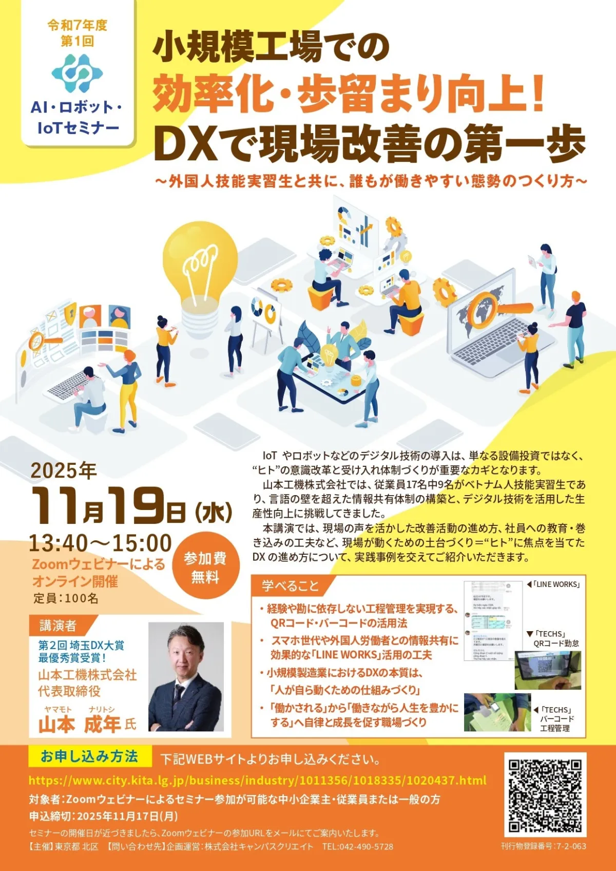 2025年11月19日(水)、東京都北区では、小規模工場の効率化や歩留まり向上をテーマにしたオンラインセミナーが開催されます。このセミナーでは、第2回埼玉DX大賞で最優秀賞を受賞した山本工機株式会社の代表取締役社長、山本成年氏を講師として迎え、中小製造業向けにIoTやロボットを用いた現実的な改善事例と有益な知識を共有します。