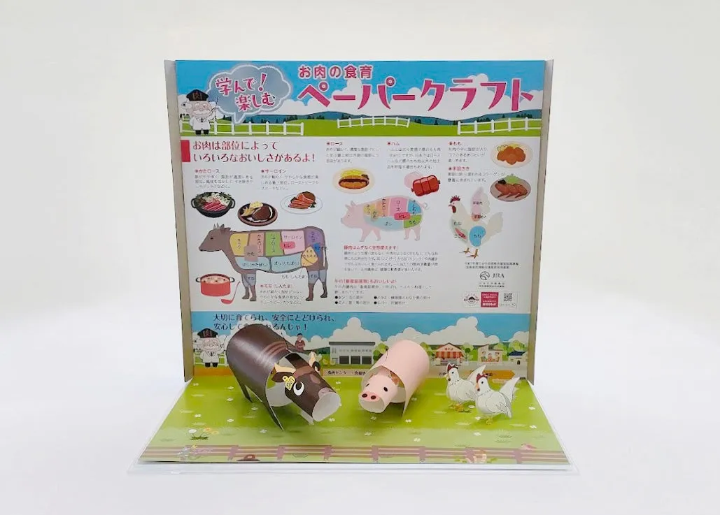 ペーパークラフト:「牛」「豚」「鶏」の各パートが含まれており、それぞれの家畜に関する情報を楽しく学びながら、手を動かして製作を楽しむことができます。