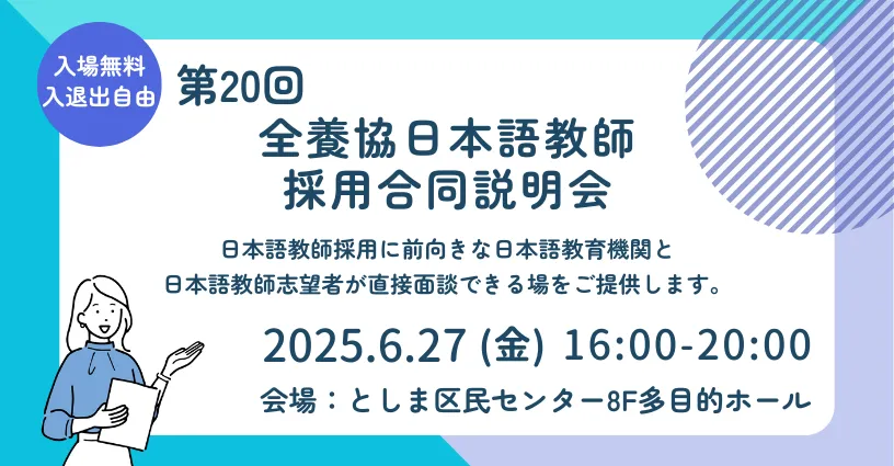 全国の日本語教育機関が一堂に集結する「第20回 全養協 日本語教師採用合同説明会」が、2025年6月27日、東京・池袋のとしま区民センターにて開催されます。このイベントでは、国内外の教育機関が出展を予定し、日本語を教える仕事についての理解を深める絶好の機会です。