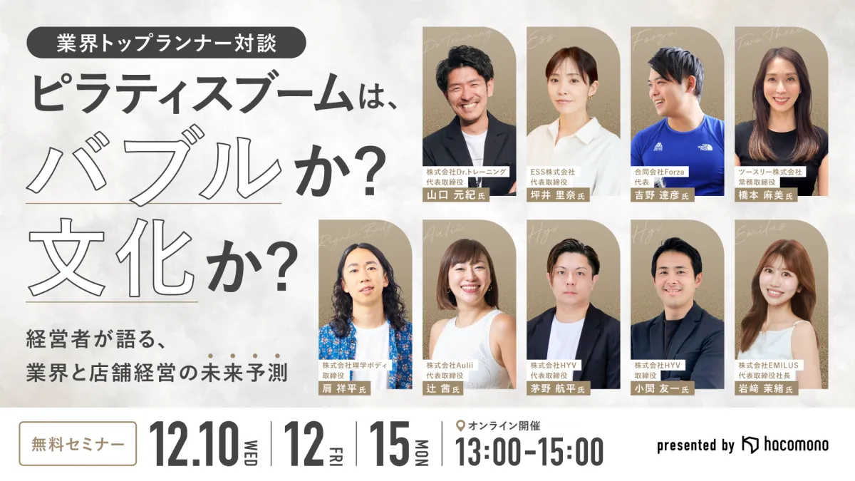 株式会社hacomonoは、急速に拡大している日本のマシンピラティス市場をテーマにしたオンラインイベントを開催します。「ピラティスブームは、バブルか?文化か?」と題された本イベントには、業界の第一線で活躍する8社の経営者が集まり、2025年12月10日(水)、12日(金)、15日(月)の3日間にわたり展開されます。