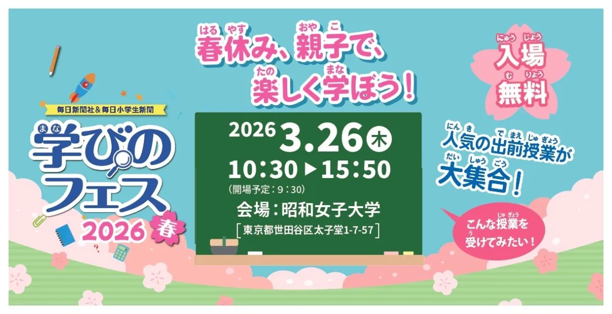 2026年の春に、親子で体験できる貴重なイベント「学びのフェス2026春」が令和の3月26日(木曜日)に東京都世田谷区の昭和女子大学で開催されます。このイベントは、毎日新聞社が主催し、企業や団体によるさまざまな出前授業を通じて、学びを楽しく体験する場を提供します。