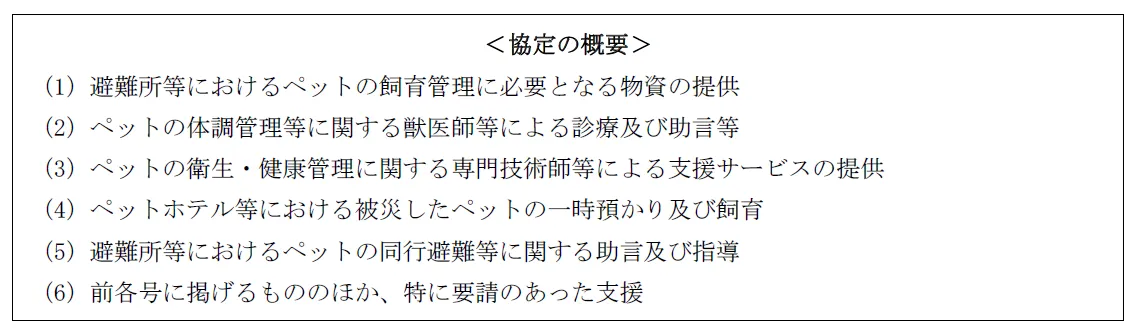 協定に基づいて、災害時には自治体が用意する避難所において、ペットのためのフードや衛生用品の提供、さらには獣医師などのイオンペットの従業員の派遣を行います。このトータルサポートによって、ペットを飼っている市民が災害発生時にも安心して避難生活を送れるようにすることが狙いです。
