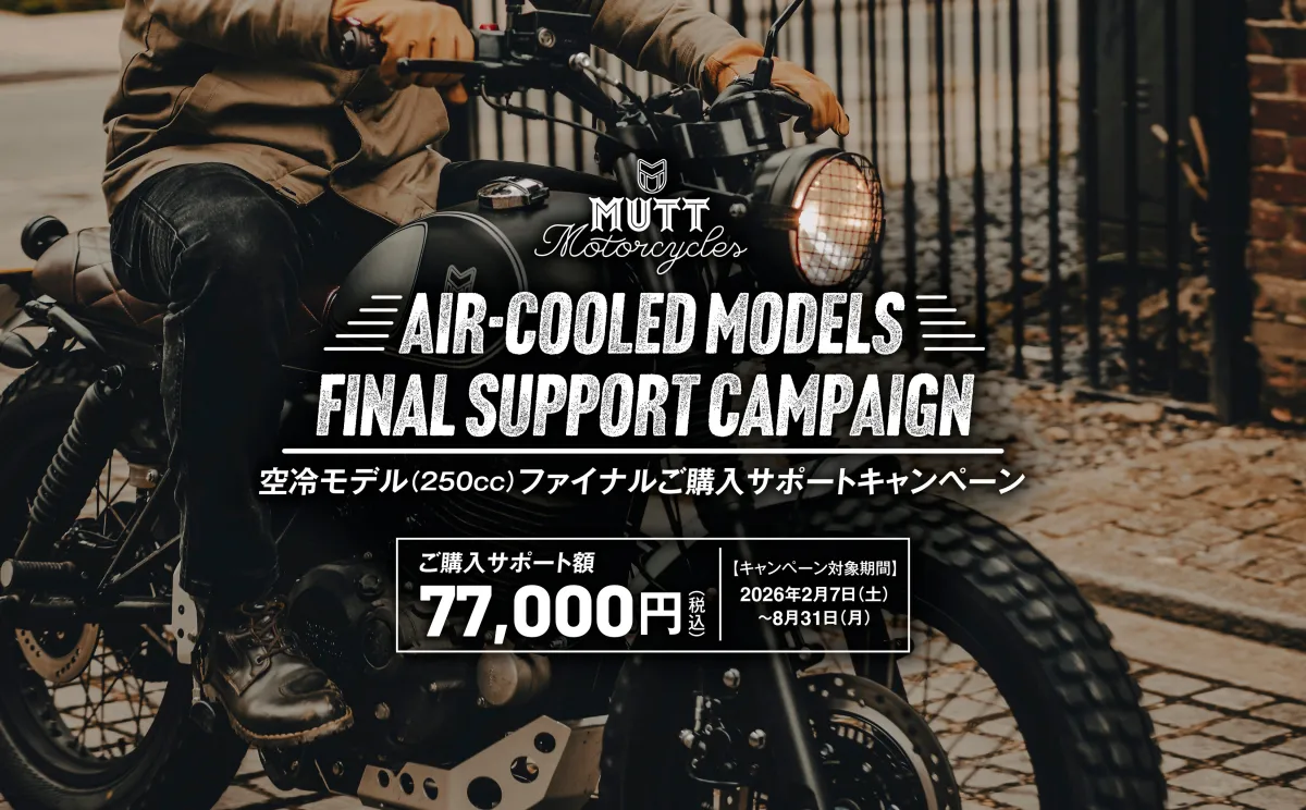 MUTT Motorcyclesは、愛好者にとって嬉しいニュースを発表しました。日本正規代理店の「マットモーターサイクルズジャパン」は、2026年2月7日から2026年8月31日まで、空冷モデル(250cc)の新車購入者を対象にした「空冷モデルファイナル購入サポートキャンペーン」を実施します。これは、MUTT Motorcyclesの新車をご成約し、期間内に車両を新規登録した方に、最大77,000円(税込)の特典を提供するものです。このサポート金額は、アクセサリーやアパレルなどの購入に使用でき、あなた自身の「MUTT LIFE」を楽しむために役立てることができます。