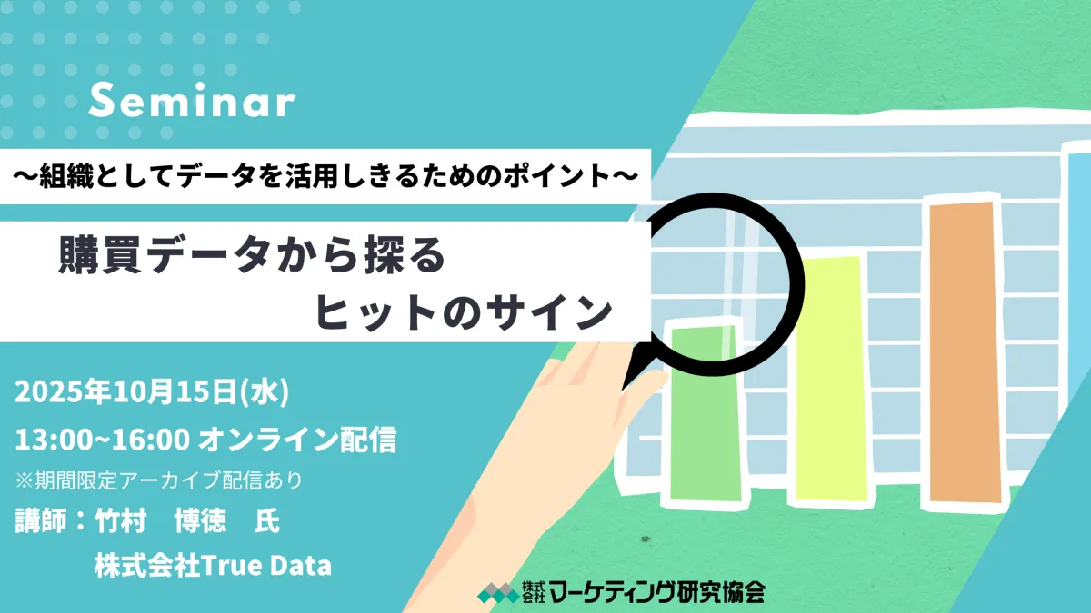 2025年10月15日、株式会社マーケティング研究協会の主催するセミナーが開催されます。このセミナーでは、様々な購買データから見えるヒット商品の兆しについて探ります。