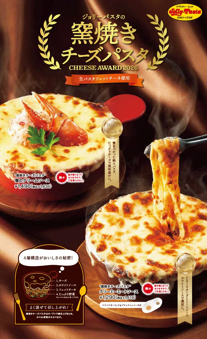 ジョリーパスタから新しい季節限定メニューが発表されました。2月5日(木)より販売される「窯焼きチーズパスタ 蟹のクリームソース」と「~播磨灘産~ 牡蠣のモッツァトマト」の2品は、冬の寒さにぴったりのホットな一品です。
