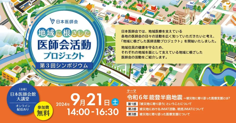 日本医師会が主催するシンポジウム「地域に根ざした医師会活動プロジェクト第3回シンポジウム」が、2023年9月21日に開催され、そのアーカイブ動画が公式YouTubeチャンネルおよび特設サイトで公開されています。このプロジェクトでは、地域医療の重要性を広く知らしめることを目的としており、今回は「令和6年能登半島地震 〜被災地に寄り添った医療支援とは?」というテーマで行われました。