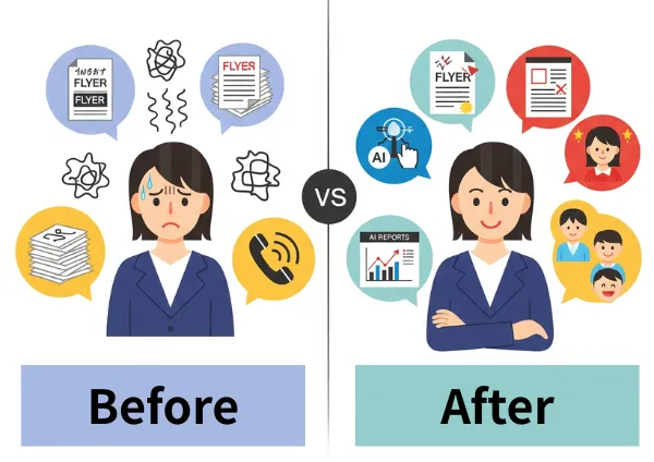 この無料コンサルティングでは、チラシ作成や保護者へのメール、SNSの更新などのノンコア業務をAIを使って効率化します。具体的には、次のような方式を提案します。