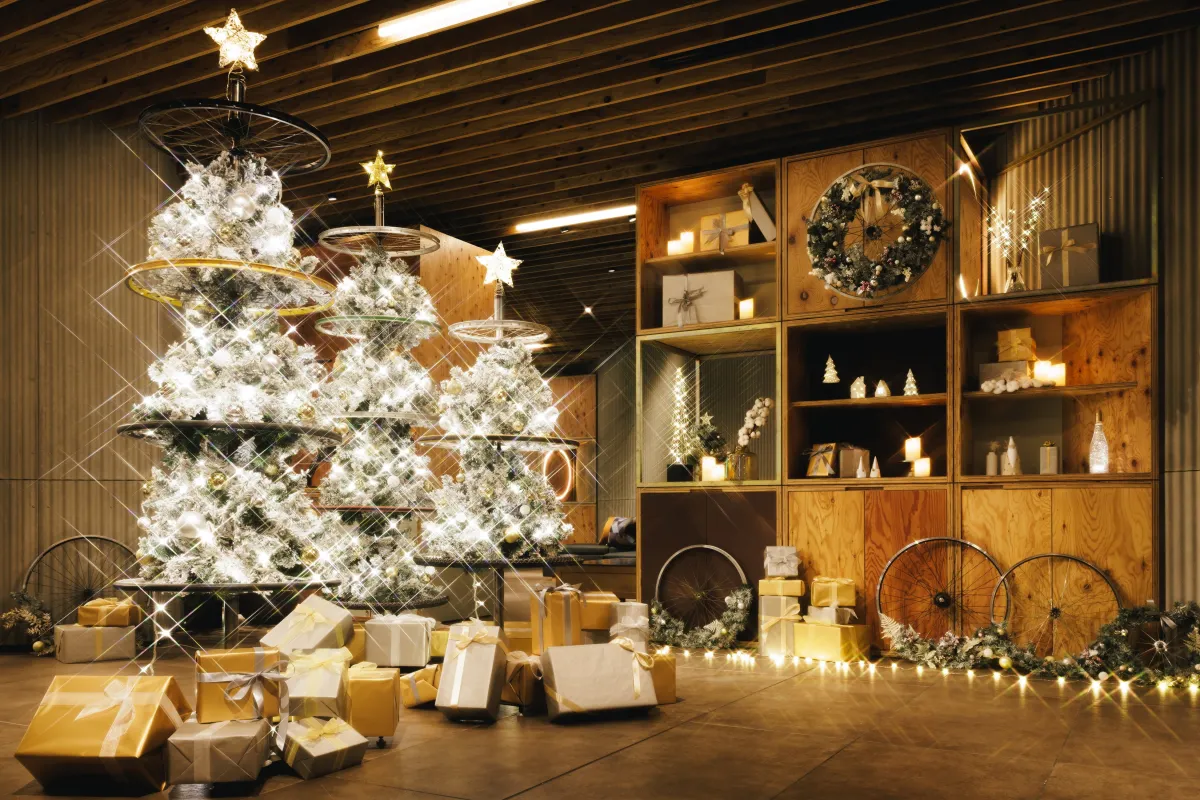次に、自転車の廃品パーツを利用して作られた「アップCYCLEツリー」と「アップCYCLEリース」が、パブリックスペース「TAMARIBA」に展示されます。さまざまなサイズの自転車ホイールやタイヤが組み合わされ、色鮮やかで心温まるクリスマスの雰囲気を演出します。