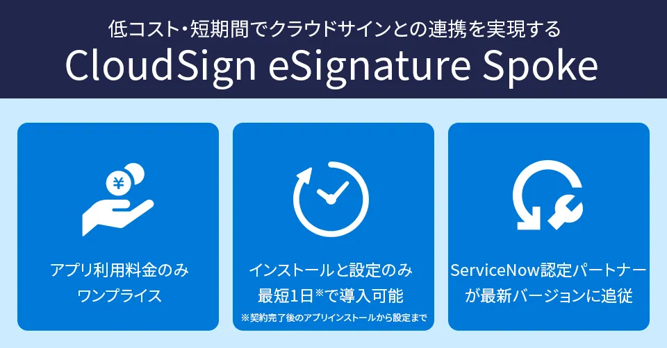 「CloudSign eSignature Spoke」は、提供されるアプリケーションとして低コスト・短時間での導入が可能です。これにより企業は、すぐに成果を実感できるでしょう。さらに、ServiceNowの高品質な保証を受けているため、安全性も確保されています。これにより、企業の契約業務の効率化が期待されます。