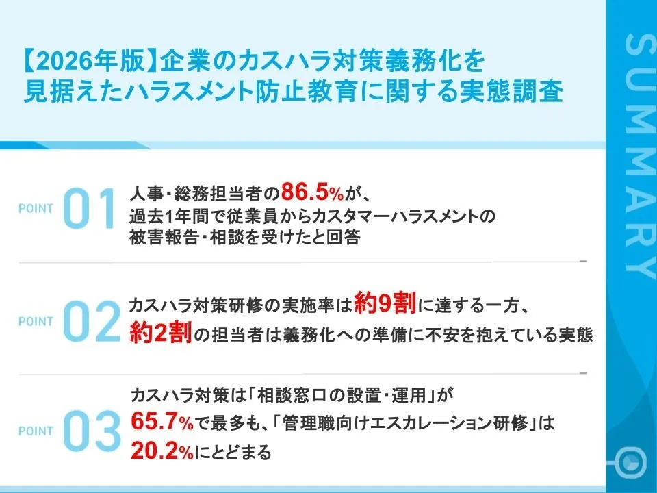 カスタマーハラスメント(カスハラ)に対する企業の対策が義務化される2026年が迫っています。今回、株式会社イー・コミュニケーションズが実施した調査では、従業員数100名以上の企業の人事や総務担当者111名を対象に、カスハラ対策の実態について詳しく調査されました。調査結果は、企業が直面している現実や今後の課題を浮き彫りにしています。