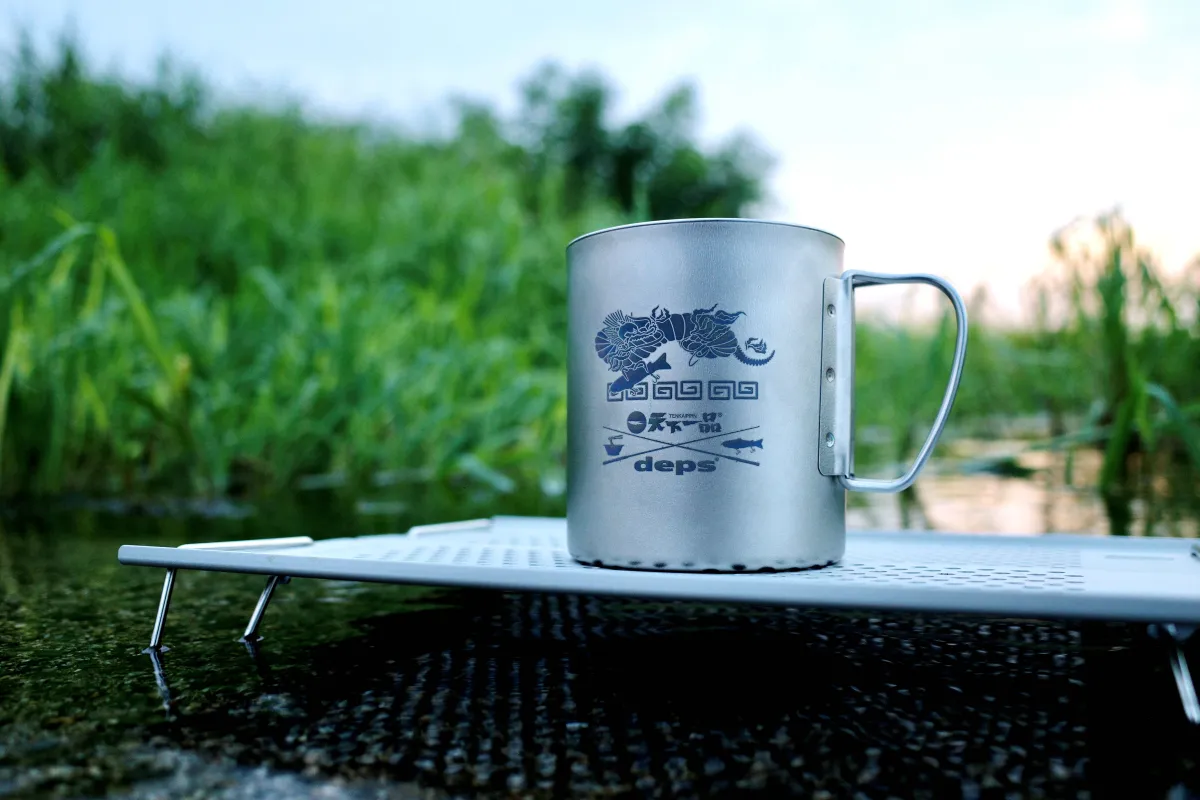 この「チタンダブルマグ450」の表面には、コラボレーションを象徴するレーザー刻印が施されています。デスアダーボディをモチーフとした龍のイラストと、天下一品とdepsの両社のロゴが描かれており、所有する喜びを誰もが感じることでしょう。