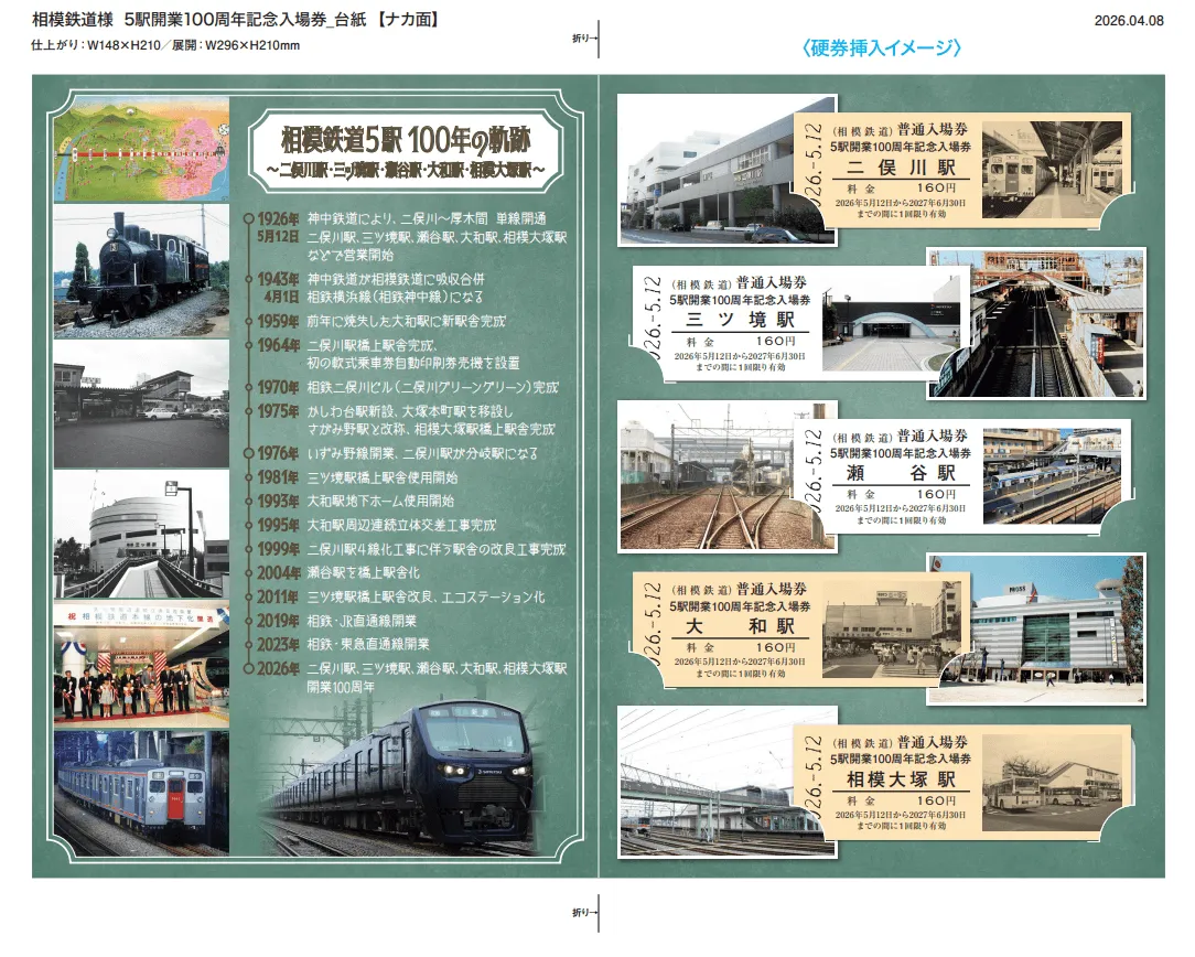 相模鉄道株式会社(本社:横浜市西区、社長:千原広司)は、1926年に前身の神中鉄道が二俣川駅から厚木駅間を開業して以来、2026年に迎える100周年を記念して特別な「5駅開業100周年記念入場券セット」を発売することを発表しました。