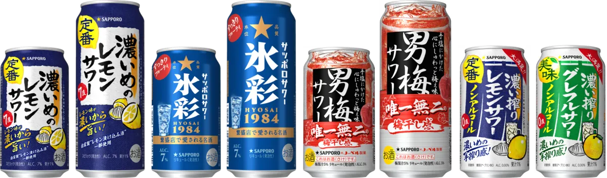 自社の主力商品である「サッポロ 濃いめのレモンサワー」や「サッポロ 男梅サワー」が全体販売を牽引しています。特に「サッポロ 濃いめ」ブランドは、居酒屋での手搾りサワーの味わいを再現し、高いコストパフォーマンスで支持を集めています。新商品の投入も投資報告の候補ですが、2023年には「サッポロサワー 氷彩1984」が新たに投入され、市場をより一層拡大しています。
