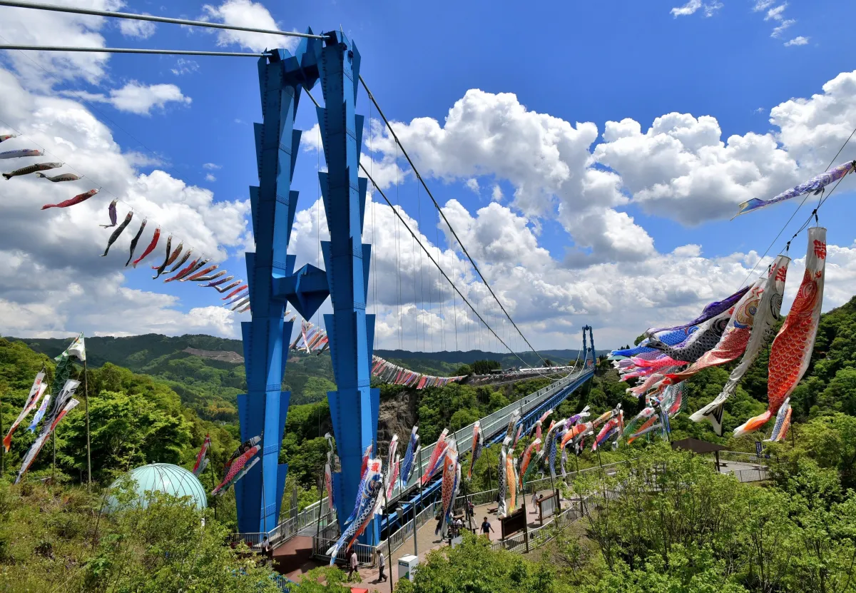 「竜神峡鯉のぼりまつり」は、4月26日から5月11日までの約2週間にわたり開催されます。この祭りでは、竜神大吊橋の上空に約500匹、周辺地域にもう約500匹の鯉のぼりが泳ぎ、合計約1,000匹が空を彩ります。特に、5月5日の子どもの日には中学生以下の子供たちが無料で渡橋できるサービスもあります。