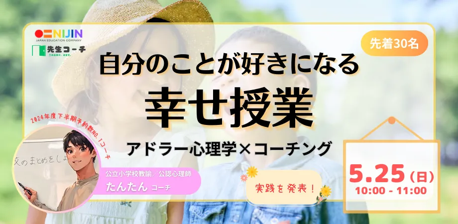 このイベントは、2025年5月25日(日)に開催されるオンラインセミナーです。対象は教育関係者や保護者、自己肯定感を高める教育に興味がある方々です。参加者は、アドラー心理学を基にしたコーチング技術を用いて、子どもたちの心を豊かにするための授業作りを学びます。