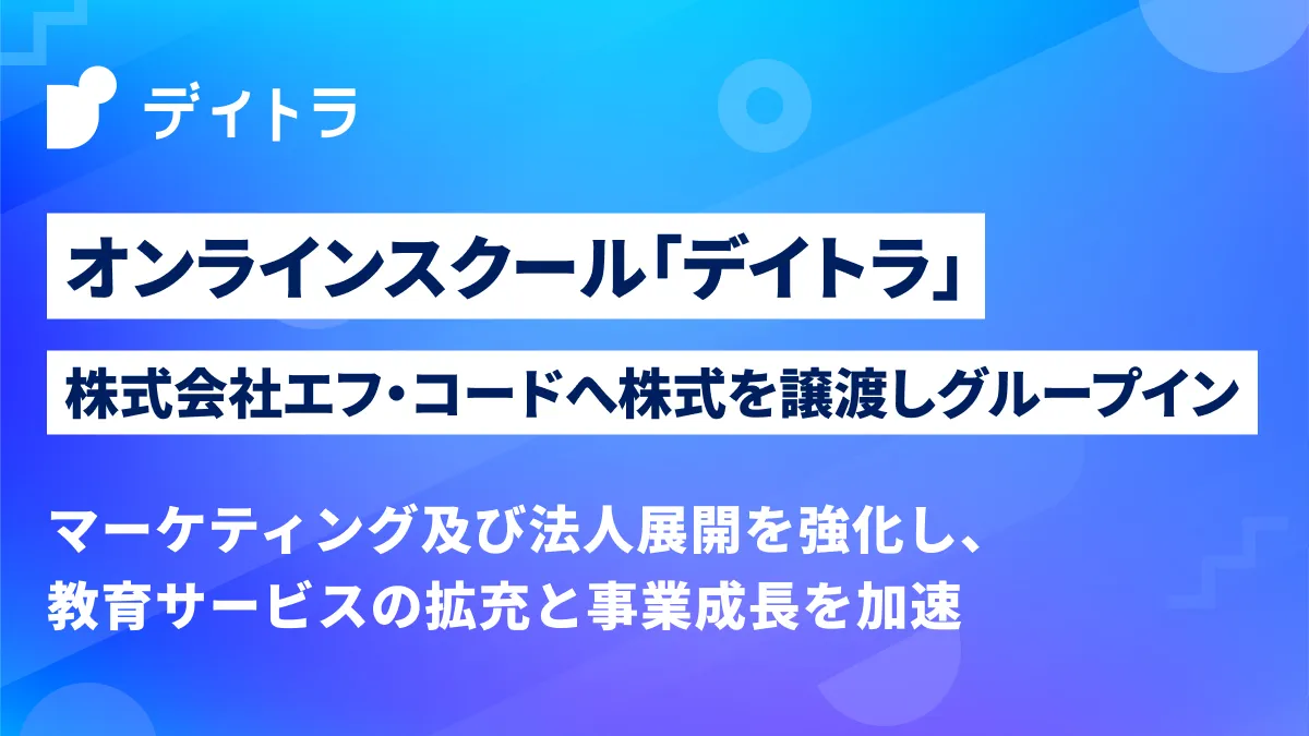 オンラインスクール「デイトラ」がこの度、株式会社エフ・コードのグループに入ることが決まりました。これは、我々の使命である「働き方に悩む人たちに新しい可能性を届けたい」という理念のもと、さらなる成長を目指すための重要な一歩です。