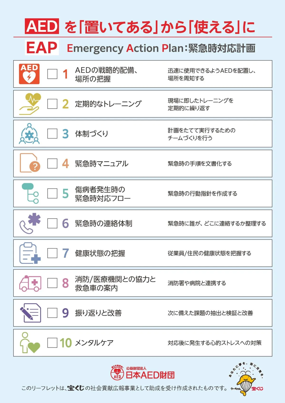 昨今、企業や団体でのCP(Contingency Plan)やBCP(Business Continuity Management)の必要性が増す中、EAPを策定することは極めて有意義です。このリーフレットを使用して、自組織の AED活用体制を整えていただきたいと思います。