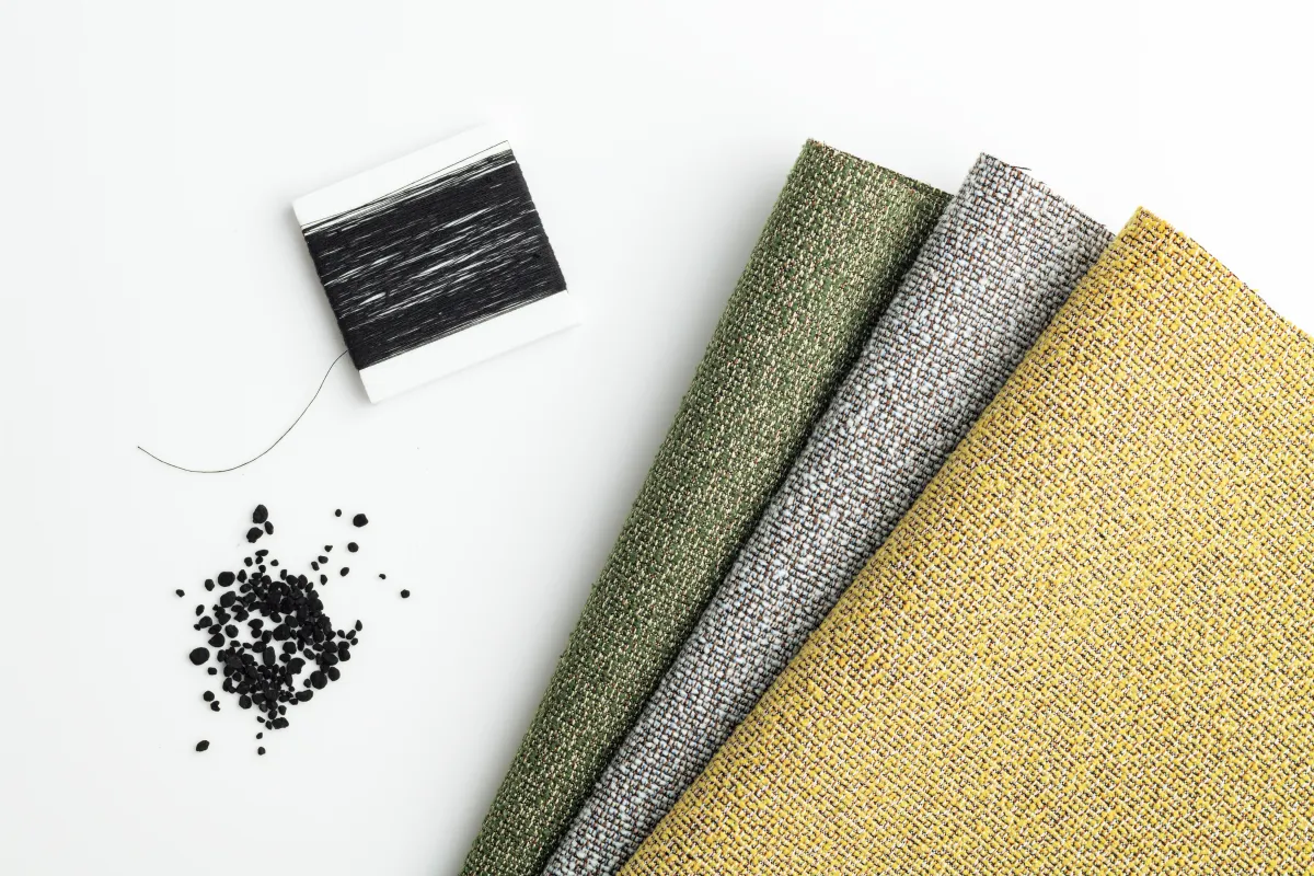 コクヨの5製品に採用された本テキスタイルは、トリポーラスを糸に練りこむ形で作られています。これにより、素材が持つ消臭・抗菌機能を損ないことなく、ジャカード組織で織り上げられることが可能になりました。また、トリポーラス本来の黒色に、さまざまな色相の糸を融合させることで、自然や植物の美しさ、さらにはその豊かさを表現したデザインが施されています。コクヨから選ばれたデザイン監修によって、インテリアに調和する高級感ある仕上がりを実現しています。