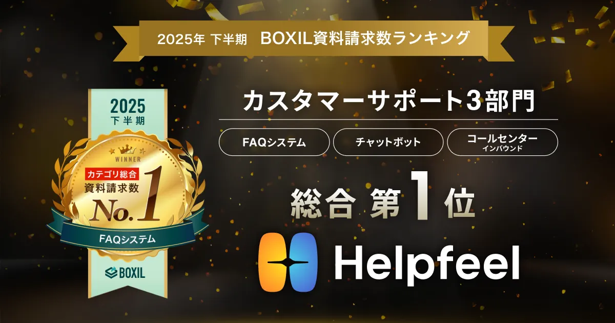 「BOXIL資料請求数ランキング」は、SaaS比較サイト「BOXIL」で行われたユーザーからの資料請求を集計して発表されるランキングです。2025年7月1日から2025年12月31日までの期間に受けた資料請求数に基づき、HelpfeelのAI検索システムはFAQシステム、チャットボット、コールセンターシステム(インバウンド)の各部門で最も多くの資料請求を受け、総合1位を獲得しました。