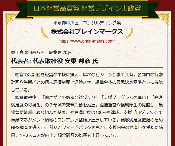 株式会社ブレインマークスの代表取締役である安東邦彦氏は、今回の受賞を非常に光栄に思っているとコメントしています。同社はコンサルティング会社として、顧客に対する組織化や仕組みづくりを支援し、経営変革に取り組んできました。自身の企業での経営品質向上にも真剣に取り組んでおり、理想の経営を日々の実践として形にしているのです。