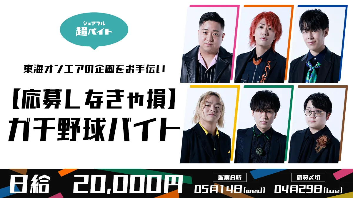 - - 仕事内容: 東海オンエアメンバーと共に野球の守備や走塁のお手伝いをするお仕事です。