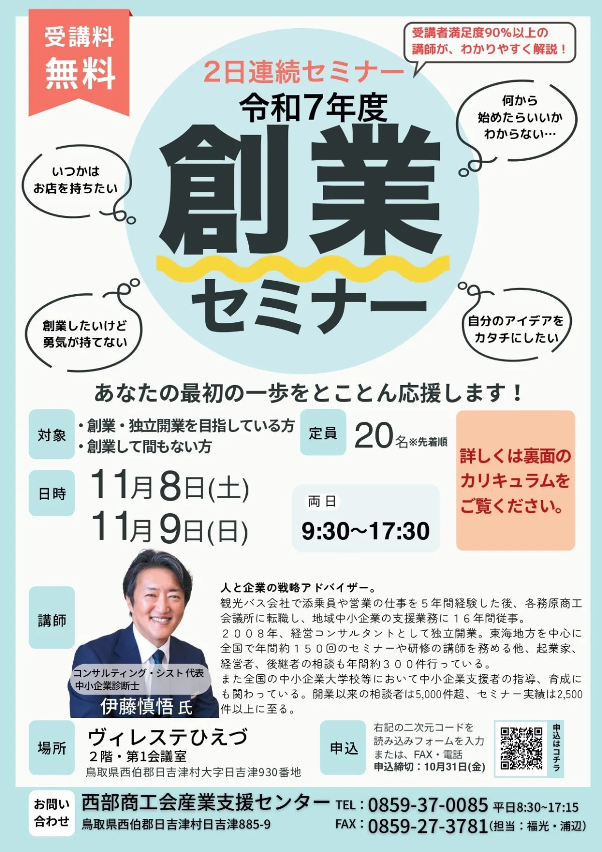 令和7年11月8日(土)と9日(日)の2日間、鳥取県商工会連合会と西部商工会産業支援センターが共同で創業セミナーを開催します。このセミナーは、創業を目指す方々に向けて、心構えから資金繰り、さらに経営戦略について学べる貴重な機会です。
