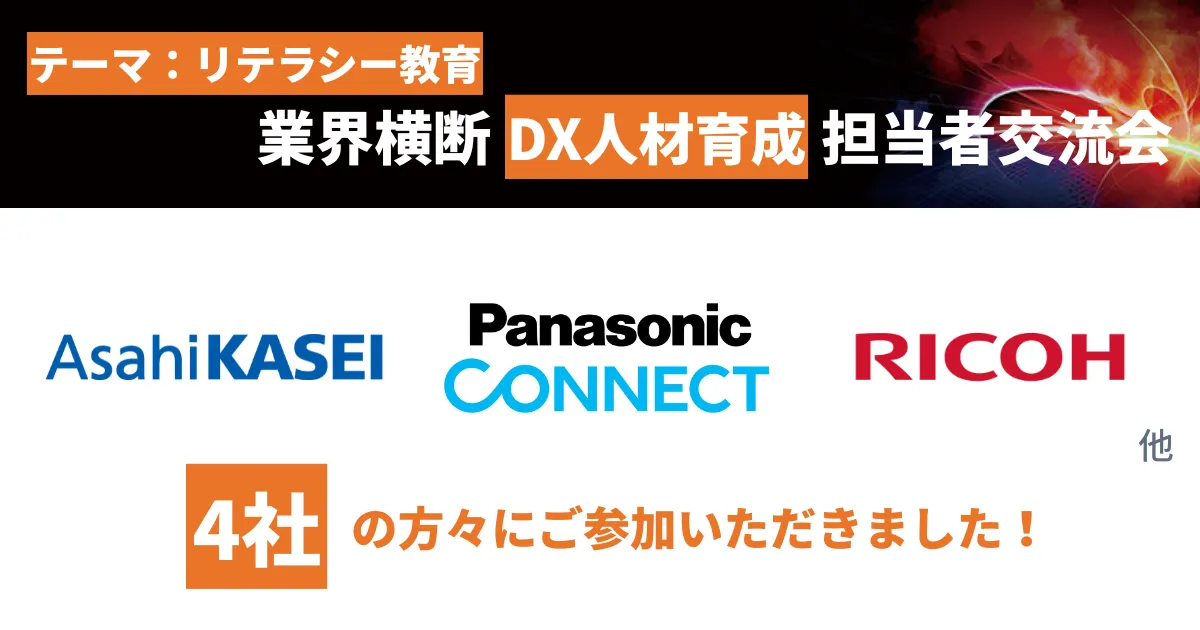 株式会社SIGNATEは、2025年6月11日に東京で「業界横断・DX人材育成に関する意見交換会【リテラシー教育の最前線】」を開催しました。このイベントには、旭化成、パナソニック コネクト、リコーなど4社から計8名の担当者が参加し、DXリテラシー教育の具体的な取り組みと直面する課題について活発な議論が交わされました。