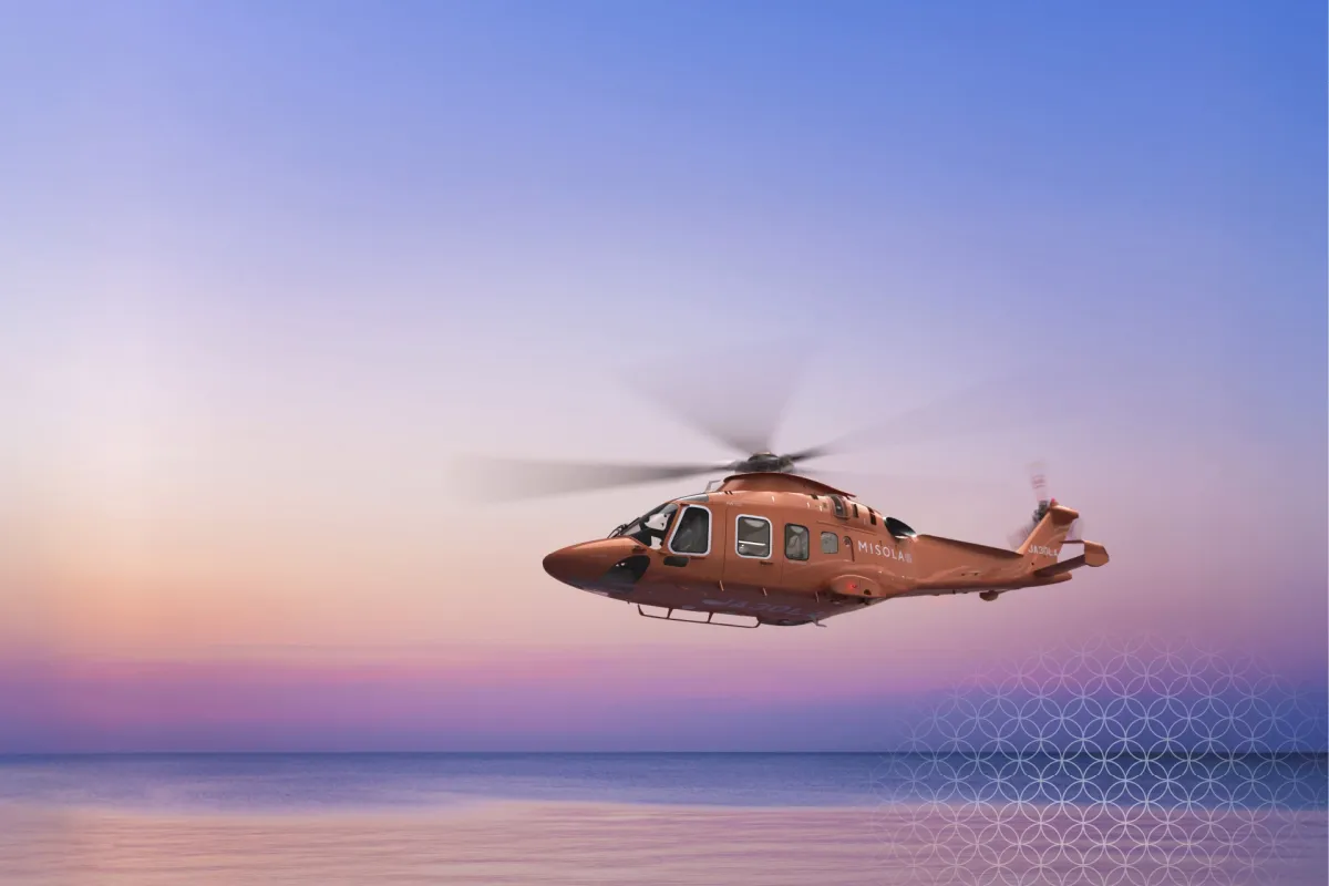 MISOLAの最大の特徴は、最新鋭の双発ジェットヘリコプター「AGUSTA AW169 MISOLA Version」を採用していることです。この機体は、日本を象徴する「日の出」をイメージした美しいデザインが施されており、機内には格調高い枯山水や七宝模様が取り入れられた完全オーダーメイドな空間が広がります。乗客には革張りのシートが用意され、快適に旅を楽しむことができます。