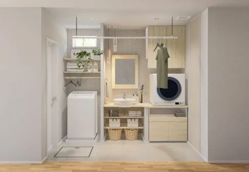 この商品の大きな特長は、家事動線を効率的にするために工夫されている点です。一般的な住まいでは、家事を行う際に動く距離が長くなりがちですが、「ヒトツ干し」はそれを短縮し、洗濯から干すまでの流れをスムーズにします。これにより、家事の負担が軽減され、時間を有効に使えるようになります。