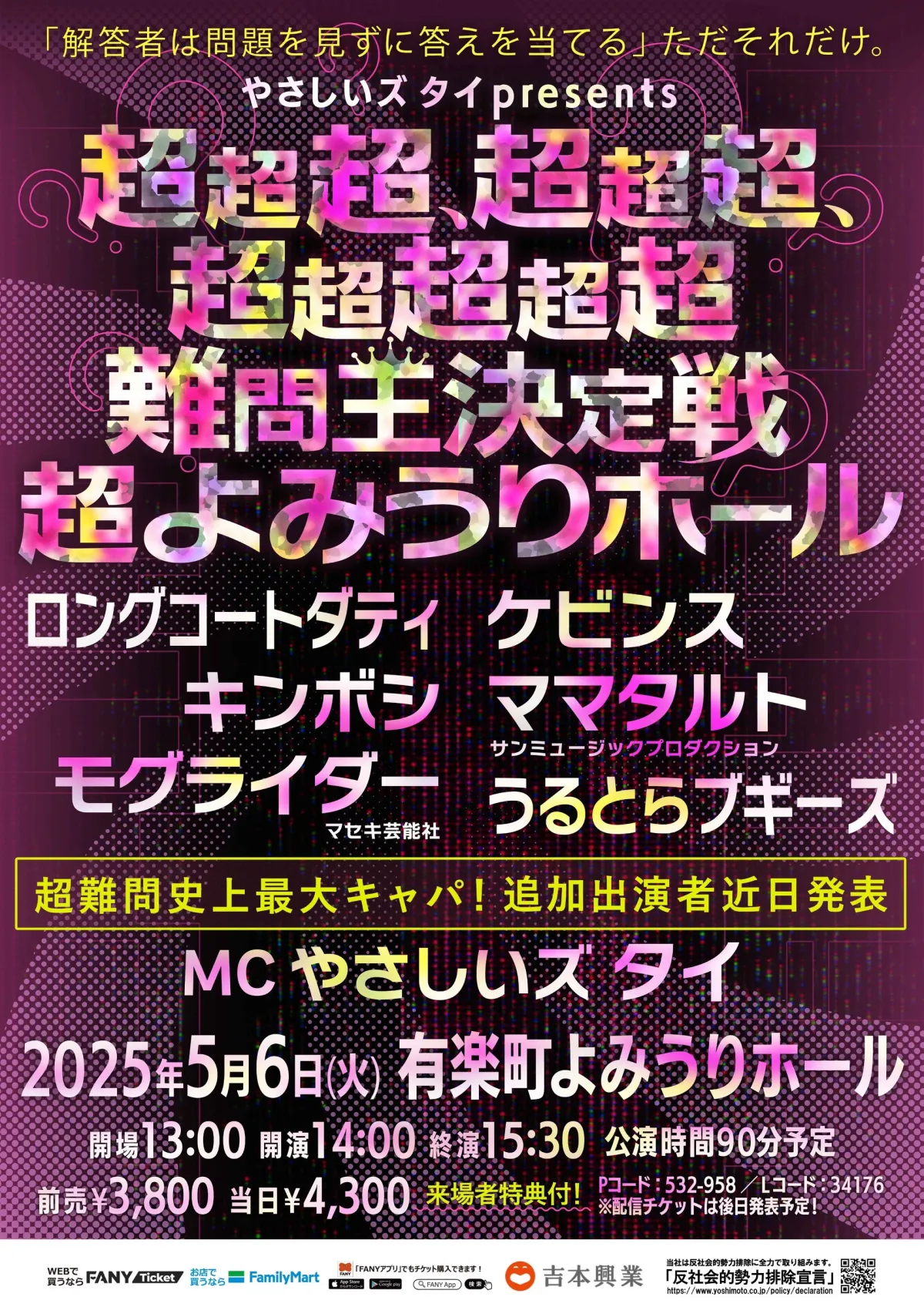 日本が誇る新感覚クイズイベント「やさしいズタイpresents「超超超、超超超、超超超超超難問王決定戦 超よみうりホール」」が予告通り、ついに有楽町よみうりホールでの開催が決定しました。このイベントは、年々その人気を増しており、とうとう千人以上を収容できる有名会場で行われることに。その名も「超超超、超超超、超超超超超難問王決定戦」という名の通り、問題の難易度は超一級です。