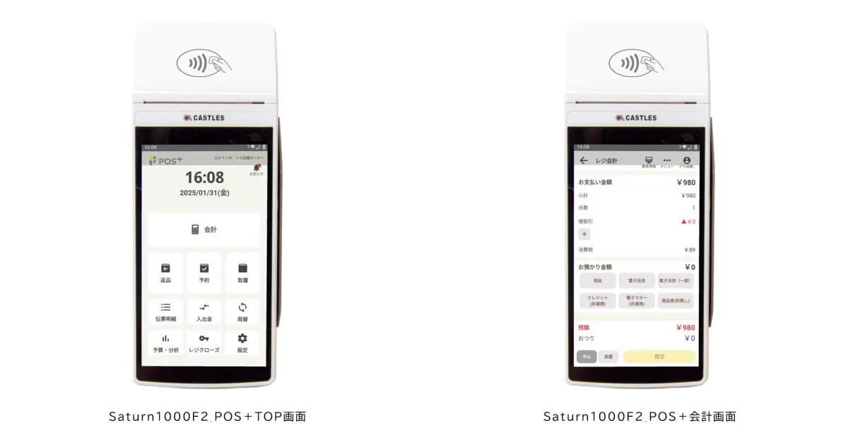今回のサービス提供の第一弾として、ポスタス株式会社のクラウド型POSレジアプリ「POS+」を搭載することで、新たな機能を店舗に提供します。「Saturn1000F2」を使って「POS+」の利用が可能になるため、従来別に用意していたPOSシステムと決済端末が一つのデバイスで実現します。この連携により、レジ周りの省スペース化やデバイスの管理負担の軽減が期待され、店舗運営の効率化が目指されます。