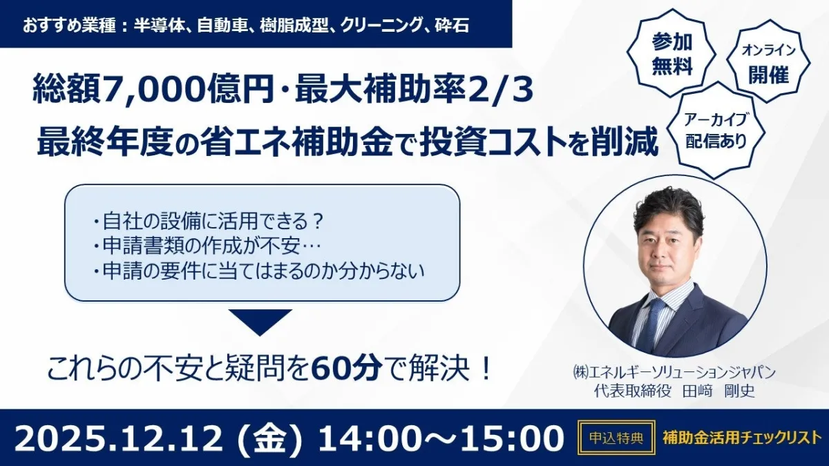 株式会社エネルギーソリューションジャパン(ESJ)は、大型省エネ補助金制度を活用した実践セミナーを2025年12月12日(木)にオンラインで開催します。このセミナーでは、経済産業省が提供する省エネ補助金の概要や活用方法について詳しく説明する予定です。特に製造業においては設備投資が避けられない課題であり、初期投資コストの削減は経営上重要なテーマとなっています。これを受け、今後の投資計画を考慮する企業へ特に役立つ内容です。