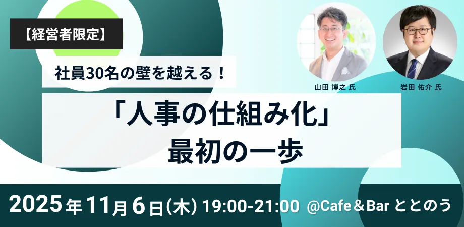 本セミナーでは、中小企業の組織課題を解決するため、「人事の仕組み化」を学びます。登壇するのは、人事制度設計の専門家である山田博之氏と、労務や法務の専門家、岩田祐介氏です。両者による「攻めの人事(評価・育成)」と「守りの人事(労務・法務)」の実践的な解説が行われます。