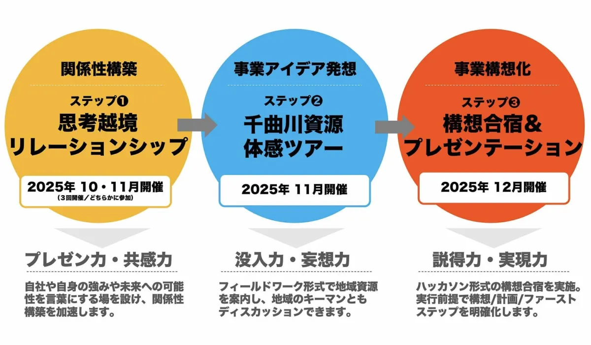 参加者は、千曲川流域における4つの市町(千曲市、上田市、東御市、立科町)の資源を探索し、地域のキーパーソンや専門機関との連携を通じて、持続可能なビジネス構想を実現していきます。今回のプログラムには、企業、地域、専門機関が協力し合う体制が整っています。