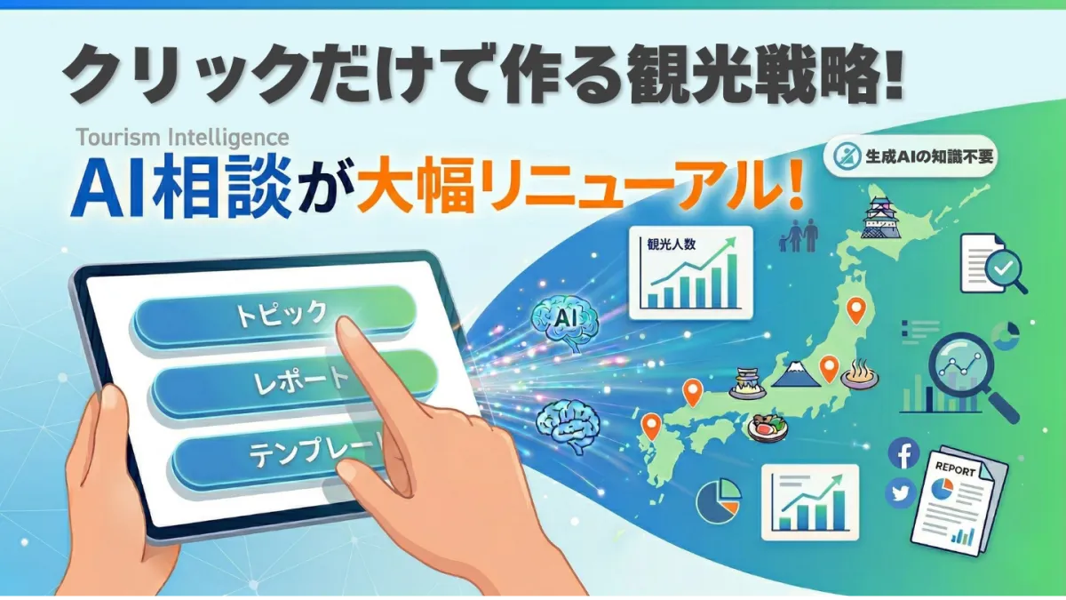 Tourism Intelligenceは、全国の観光データや政府の統計をAIが横断的に分析し、観光ビジネスに役立つ情報を提供するプラットフォームです。新しいAI相談機能では、ユーザーがカテゴリーやキーワードをクリックするだけでAIが質問に回答し、観光施策の立案をサポートします。