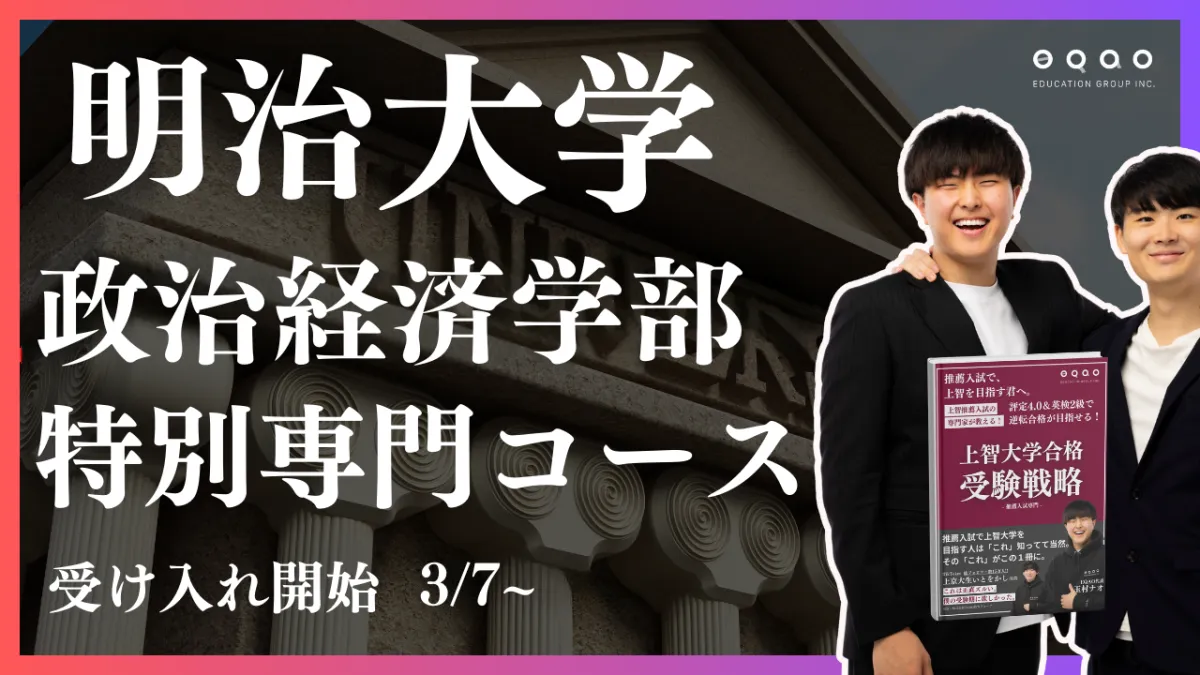 明治大学の政治経済学部に進学を考えている高校1・2年生に朗報です! 2024年から、GMARCHグループでも圧倒的な合格実績を誇る総合型選抜専門塾「EQAO」が、政治経済学部の特別入試に特化した専門対策コースを新たに開講します。このコースは、大学選びを考えている高校生にとって大切な一歩となるでしょう。特に、進路選択に悩んでいる方にとって、明確なビジョンを提示するための有力なサポートとなります。