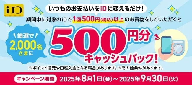 株式会社NTTドコモは、2025年の夏に「iD利用で当たる!500円分キャッシュバックキャンペーン」を開催します。このキャンペーンは、8月1日から9月30日までの期間中に、対象の電子マネー「iD」を利用して500円以上のお支払いをした方々を対象に、抽選で2,000名に500円のキャッシュバックを行うという内容です。