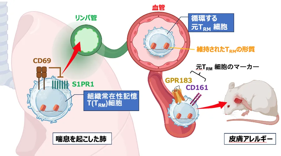 TRM細胞は、皮膚や肺、腸などの末梢臓器に長期間とどまり、病原体に対する記憶を保持しています。しかし、アレルギーや自己免疫疾患の発症に関与することがあるこの細胞の動態は、これまで十分に理解されていませんでした。今回の研究は、TRM細胞が炎症を引き起こす性質を保持しつつ体内で経路を変更するという新たな事実を示唆しています。