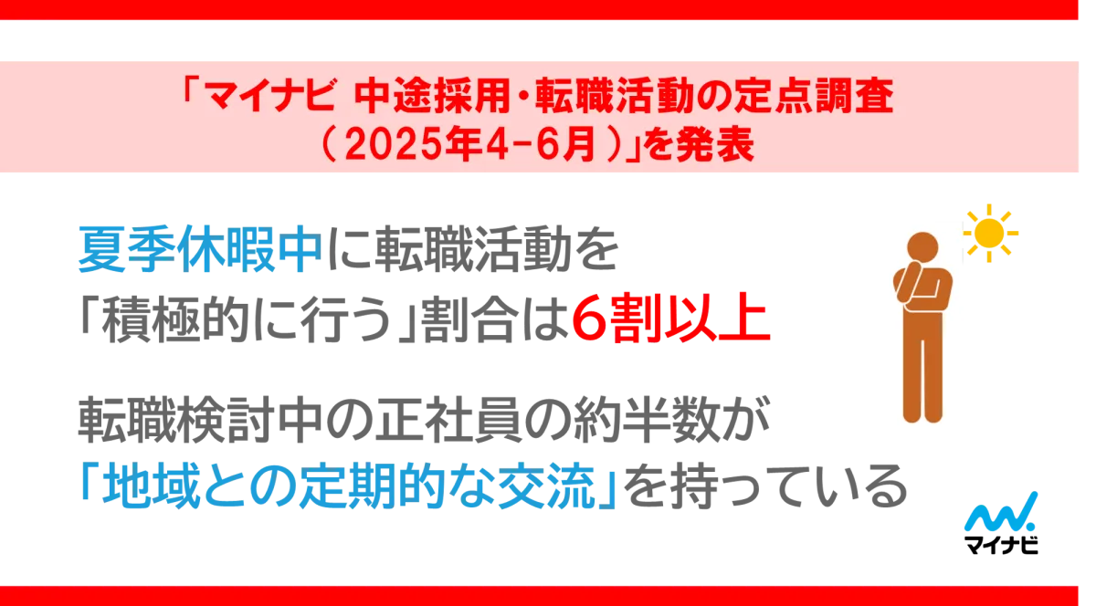 夏季休暇を前に、地域との接点が増するこの時期、転職活動も活発化することが予想されます。調査結果は、地域との関わりがキャリア形成に影響を与えることを示唆しており、これは自身の将来や地域活性にとって重要な要素です。企業や求職者にとっても、この地域との関わりが新たなビジネスチャンスを生み出す契機となるかもしれません。