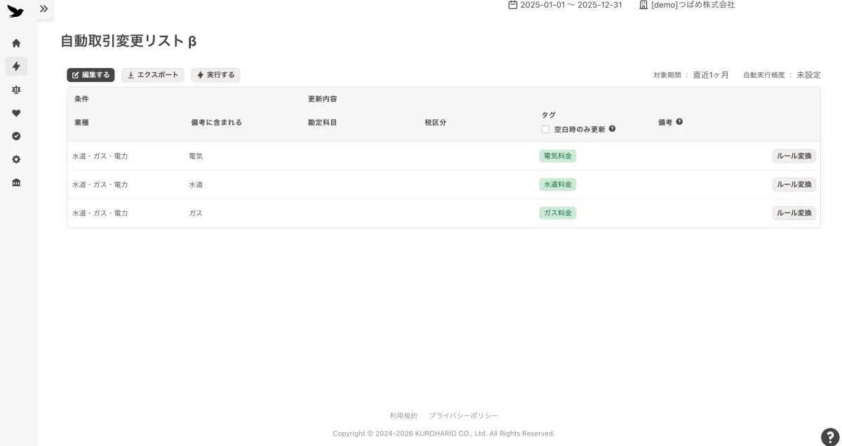 もともとOCRで読み込まれたデータ、特に業種や店舗名、税率情報をもとに、条件に合致すれば自動でタグ付けを行い、適切な税区分や勘定科目に修正を施します。これにより、取引データは、自社の会計ルールに沿った“あるべき形”に自動で整えられます。