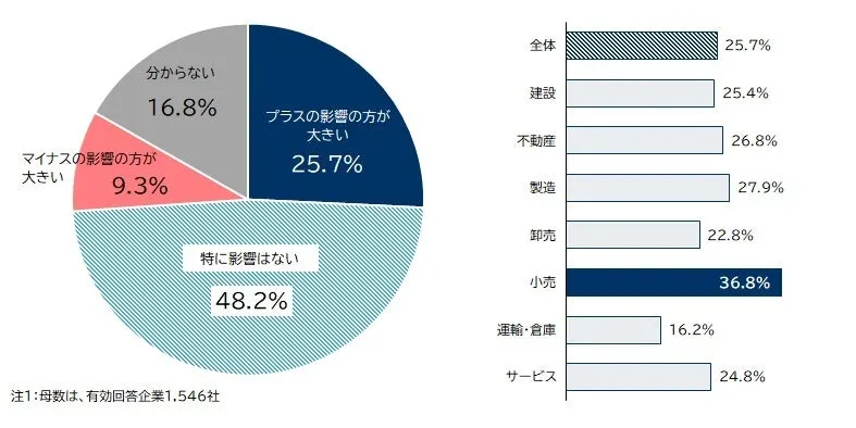 調査対象となったのは1,546社。結果として、25.7%が減税を「プラス」と評価。その中でも小売業界の意見が最も前向きで、36.8%が期待感を示しました。例えば、ある小売業者は「消費者の購買意欲が高まり、ダイレクトに売上増加に繋がる」と楽観的です。また、耐久消費財に関しては、「高額商品の需要が増える」という意見もあります。