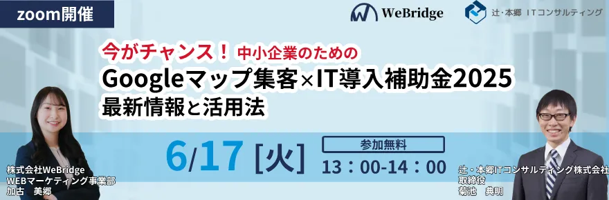 デジタル化が加速する現代、特に中小企業にとっての集客は大きな課題です。そこで、2025年6月17日午後1時から無料ウェビナーを開催します。このウェビナーでは、Googleマップを使った集客方法や、IT導入補助金に関する最新情報を提供します。