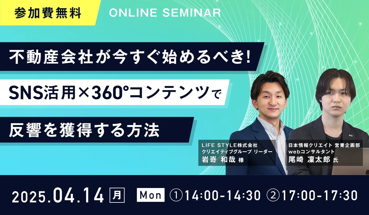 日本情報クリエイト株式会社は、2025年4月14日(月)に「不動産会社が今すぐ始めるべき! SNS活用×360°コンテンツで反響を獲得する方法」という無償のオンラインウェビナーを行うことを発表しました。このウェビナーでは、実際にどのようにして不動産会社がSNSを活用し、顧客の反響を得るかについて具体的な解決策を提示します。