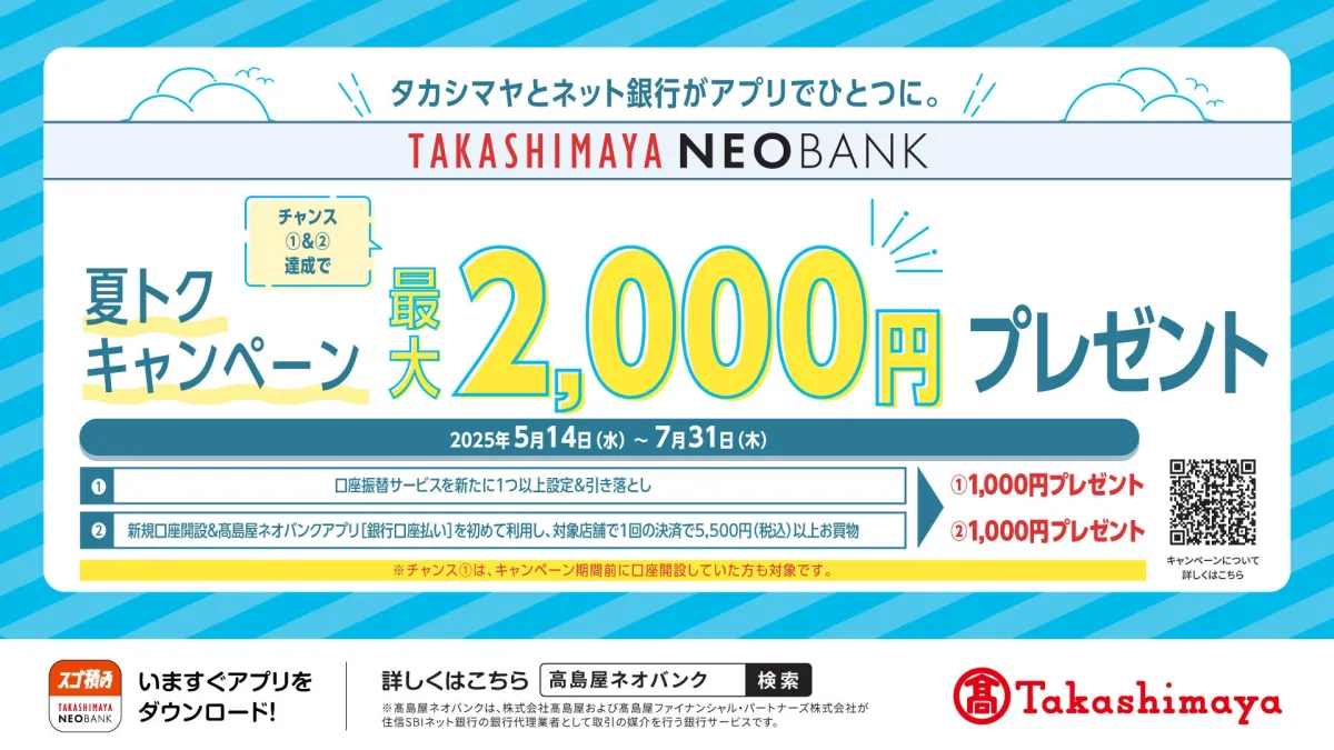 株式会社高島屋と住信SBIネット銀行がタッグを組み、2025年5月14日から7月31日までの期間限定で「高島屋ネオバンク 夏トクキャンペーン」を開催します。このキャンペーンでは、新規口座開設や口座振替サービスの設定を行うことで、最大2,000円のお得な特典が得られるチャンスです。