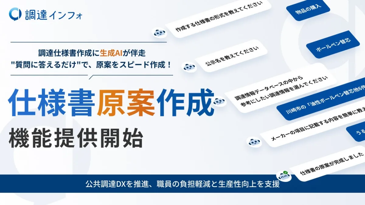 「調達インフォ」は、約8,900の公的機関から集まった2,560万件の入札・落札情報を網羅した調達情報サービスです。このプラットフォームは、880機関以上の調達担当者によって利用され、業務の効率化に貢献しています。新機能は、質問に答えるだけで生成AIが仕様書の原案を自動生成するという仕組みです。