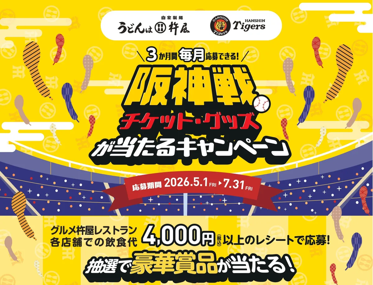 私たちの球団、阪神タイガースを応援しよう!この夏、グルメ杵屋レストランがテーマの阪神タイガース応援キャンペーンを実施します。期間は2026年5月1日から7月31日までの3か月間で、皆さんが参加できるワクワクの企画が盛りだくさんです。まずは、阪神タイガースのレギュラーパートナーとして活動を開始したグルメ杵屋が、タイガースファンを一緒に盛り上げるための特別なキャンペーンとして、毎月応募できるチャンスを提供します。