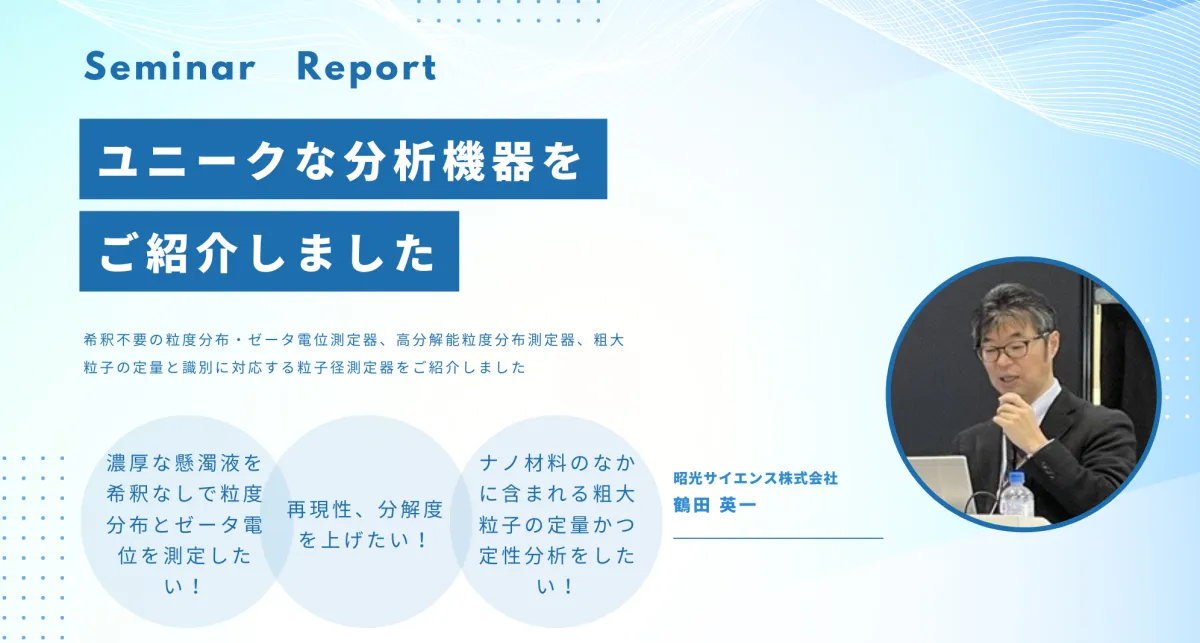 特に注目されたのが、1月30日に開催されたセミナーです。昭光サイエンス株式会社の鶴田英一氏は、「ユニークな粒度分布・ゼータ電位測定器」をテーマに45分間にわたりその特長と利点について解説しました。参加者からは多くの質問が寄せられ、盛況のうちに進行されました。